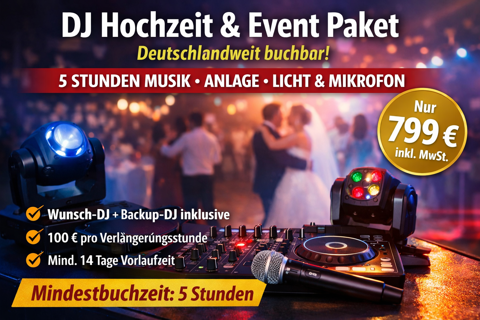 Die Mindestbuchzeit beträgt 5 Stunden und umfasst bereits eine hochwertige Beschallungsanlage, zwei Lichteffekte für die Tanzfläche sowie ein Funkmikrofon für Reden, Moderation oder Programmpunkte wie den Hochzeitstanz.