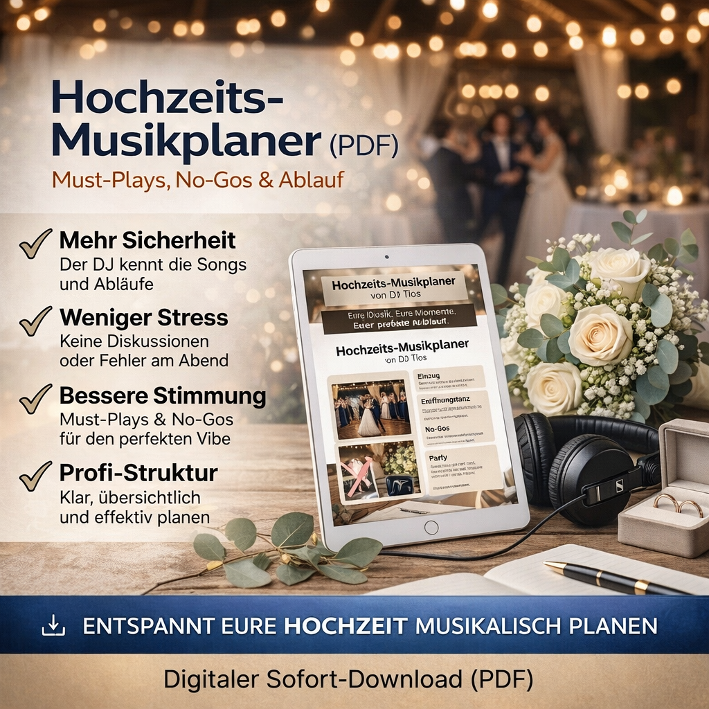 Mit dem Hochzeits-Musikplaner von DJ Tios könnt ihr eure Hochzeitsmusik strukturiert und stressfrei planen. Der Planer hilft euch dabei, alle wichtigen Songs, Programmpunkte und Wünsche übersichtlich festzuhalten.